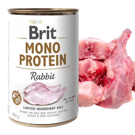 Brit Mono Protein Rabbit 400 g to pełnoporcjowa mokra karma dla psów dorosłych, stworzona specjalnie z myślą o delikatnym żywieniu eliminacyjnym.
