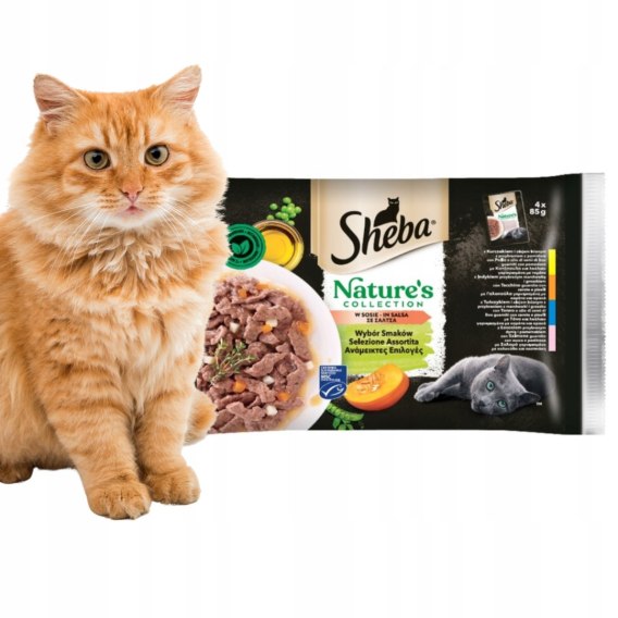 SHEBA Nature's Collection Wybór Smaków to pełnoporcjowa mokra karma dla kotów w czterech odsłonach smakowych. Zamknięte w poręcznej saszetce, idealnej na jedną porcję, delikatne kawałki w aromatycznym sosie: z kurczakiem i olejem lnianym z przybraniem z pomidora, z indykiem przybranym marchewką i groszkiem, z tuńczykiem i olejem lnianym z przybraniem z marchewki i groszku, z łososiem przybranym dynią i pasternakiem. Jedzenie zostało przygotowane w taki sposób, aby rozpieścić podniebienie nawet najbardziej wybrednego kociego pupila. Sekretem receptury Sheba Nature's Collection są starannie wyselekcjonowane naturalne składniki wysokiej jakości oraz witaminy i minerały. Posiłki nie zawierają zbóż, sztucznych aromatów i barwników.